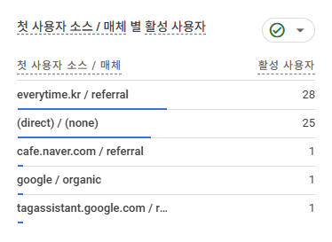 첫 사용자 수치와 실제 수치가 차이가 나는 이유는 에브리타임이나 네이버 카페 앱에서 사이트를 접속할 경우 브라우저가 아닌 웹뷰 형식으로 연결되어 (direct) / (none) 으로 수집되기 때문에 수작업으로 유입 사용자를 집계 해주었습니다.