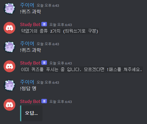 안녕하세요. 고등학생 개발자 주이어입니다. 오늘 소개할 프로젝트는 제가 고등학교 1학년 때 만든 공부를 도와주는 디스코드 봇입니다. 작동 방식은 사용자가 추가한 문제들 중에서 랜덤으로 뽑아 문제를 출제하고 답을 입력하면 맞았는지 틀렸는지를 알려주는 봇입니다. 만들게 된 계기는 고등학교 1학년 때 암기과목이 많아서 조금 더 효율적으로 공부할 수 있는 방법이 없을까 고민하던 중에 평소에 자주 사용하는 디스코드에 이러한 봇을 만든다면 틈틈히 공부를 할 수 있겠구나 라는 생각이 들어 만들게 되었습니다. 봇 제작은 'Python'과 'Discord'모듈을 이용해서 제작하였습니다.