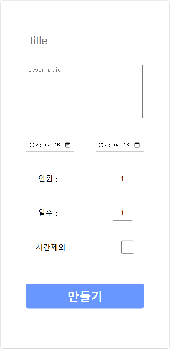 먼저 사용자가 입력한 값을 저장하기 위해서 useState를 사용한 input 객체를 생성해주었다. input 객체는 제목, 설명, 시작 날짜, 종료 날짜, 인원, 일수, 기타 설정 등을 저장한다. 그 후 onChangeInput이라는 함수를 만들어 입력한 값에 변화가 생기면 변화된 값으로 input 객체에 저장되도록 해주었다. 날짜 데이터와 기타 설정 데이터는 일반 데이터 형식이 아닌 Date또는 Bool 형식의 데이터이기 때문에 따로 예외 처리를 해주었다.
