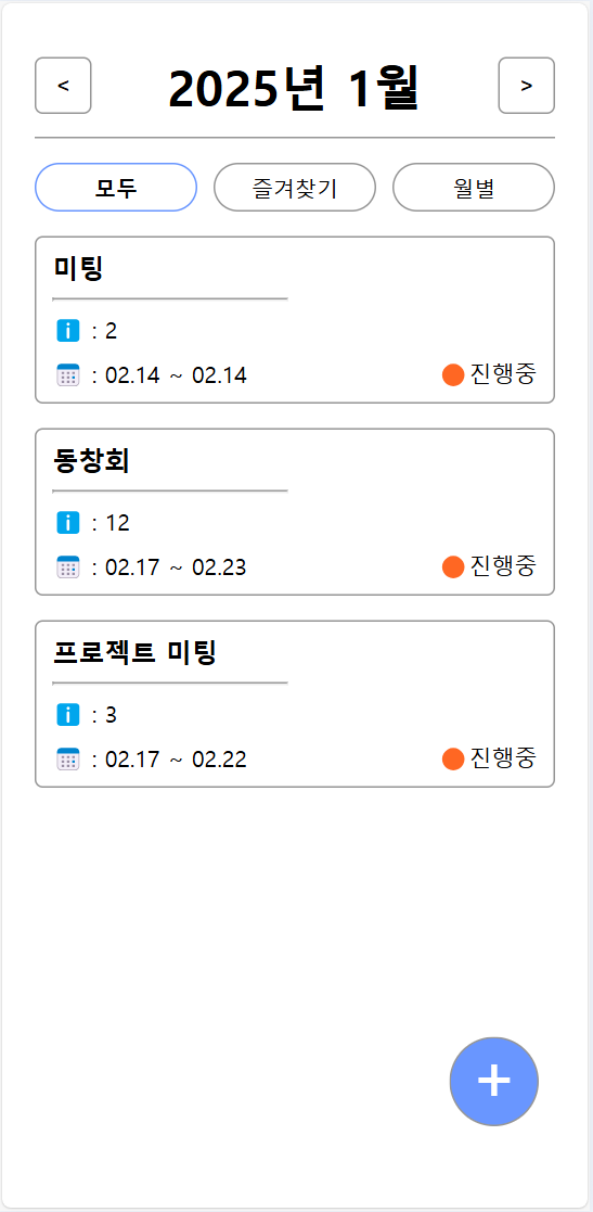 위의 사진과 같이 만들기 버튼을 누르면 자동으로 Home 페이지로 이동되며, 실시간으로 추가된 데이터가 반영되어 일정 목록에 추가되는 것을 알 수 있다.