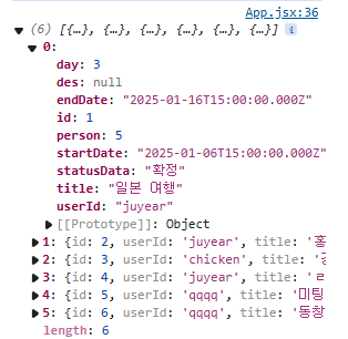 console.log로 가져온 데이터를 확인해보면 일정 데이터를 잘 가져오는 것을 알 수 있다.