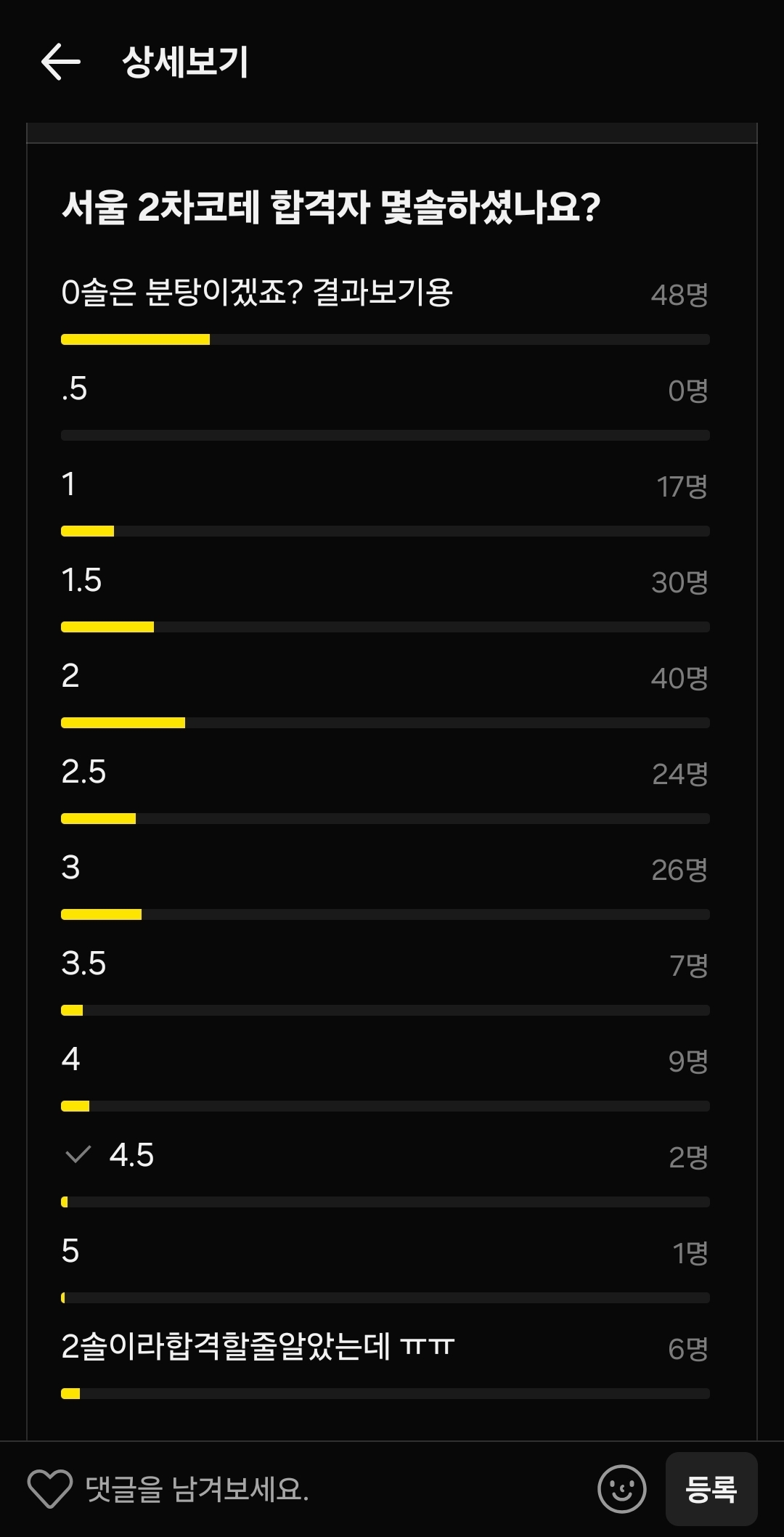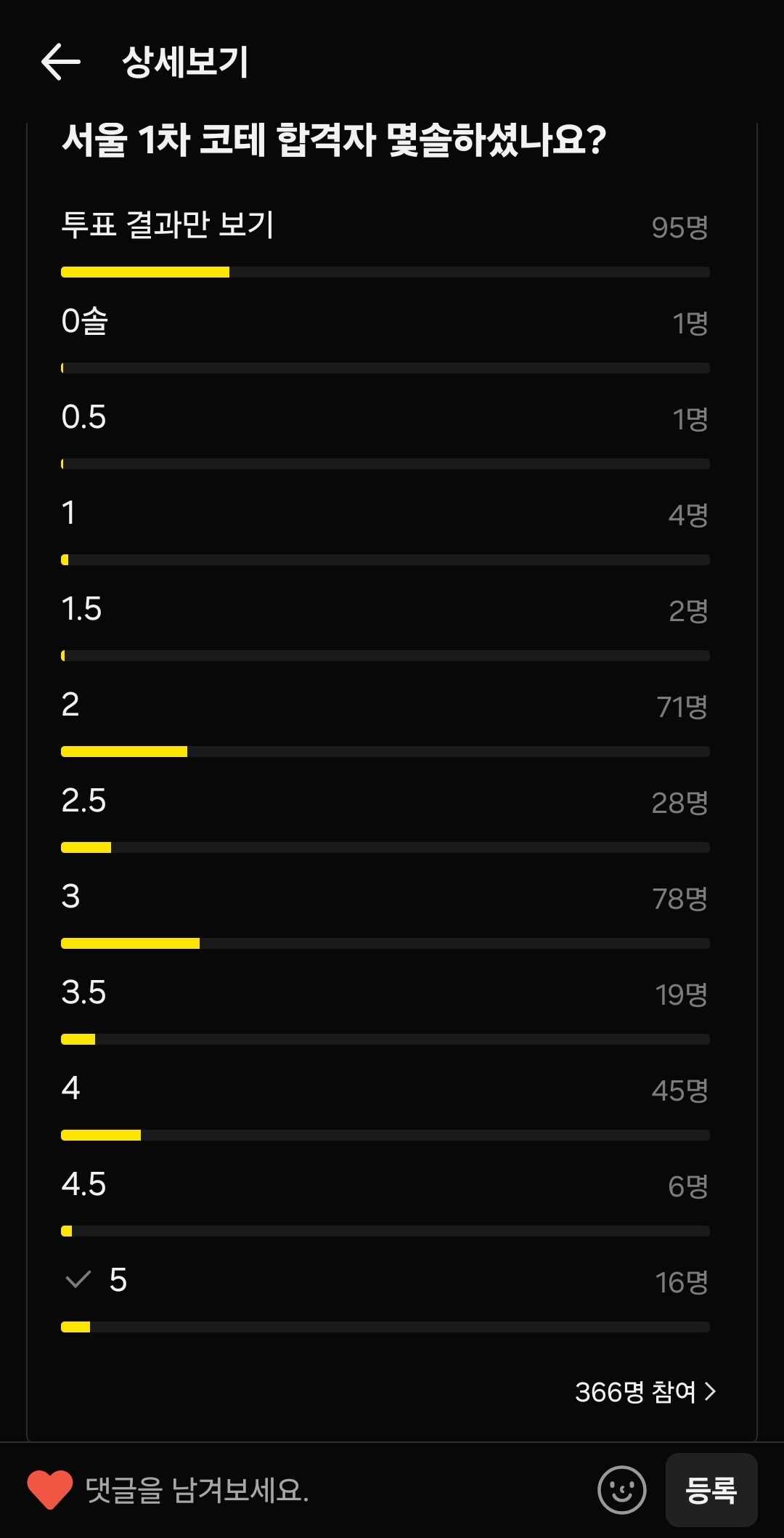 1차 합격자 기준 5솔은 16명이 투표해주었습니다. (투표자 271명)