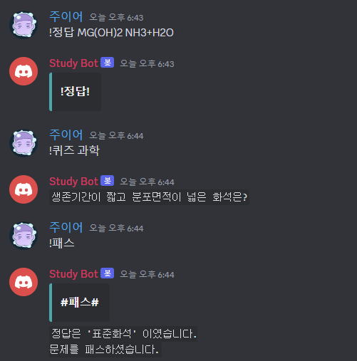 안녕하세요. 고등학생 개발자 주이어입니다. 오늘 소개할 프로젝트는 제가 고등학교 1학년 때 만든 공부를 도와주는 디스코드 봇입니다. 작동 방식은 사용자가 추가한 문제들 중에서 랜덤으로 뽑아 문제를 출제하고 답을 입력하면 맞았는지 틀렸는지를 알려주는 봇입니다. 만들게 된 계기는 고등학교 1학년 때 암기과목이 많아서 조금 더 효율적으로 공부할 수 있는 방법이 없을까 고민하던 중에 평소에 자주 사용하는 디스코드에 이러한 봇을 만든다면 틈틈히 공부를 할 수 있겠구나 라는 생각이 들어 만들게 되었습니다. 봇 제작은 'Python'과 'Discord'모듈을 이용해서 제작하였습니다.