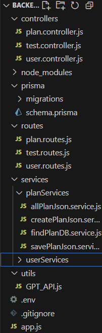 보시는 것과 같이, controllers, prisma(ORM도구), routes, services, utils, app.js(메인 코드)로 이루어져 있습니다.
